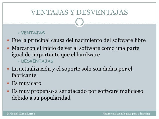 - 10. VENTAJAS Y DESVENTAJAS VENTAJAS Fue la principal causa del nacimiento del software libre Marcaron el inicio de ver al software como una parte igual de importante que el hardware DESVENTAJAS La actualización y el soporte solo son dadas por el fabricante Es muy caro Es muy propenso a ser atacado por software malicioso debido a su popularidadMª Isabel García Larrea Plataformas tecnológicas para e-learning