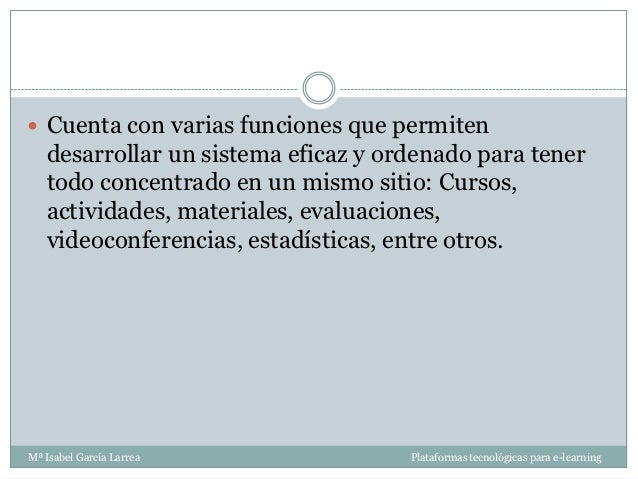 - 14. Cuenta con varias funciones que permiten desarrollar un sistema eficaz y ordenado para tener todo concentrado en un mismo sitio: Cursos, actividades, materiales, evaluaciones, videoconferencias, estadísticas, entre otros.Mª Isabel García Larrea Plataformas tecnológicas para e-learning
