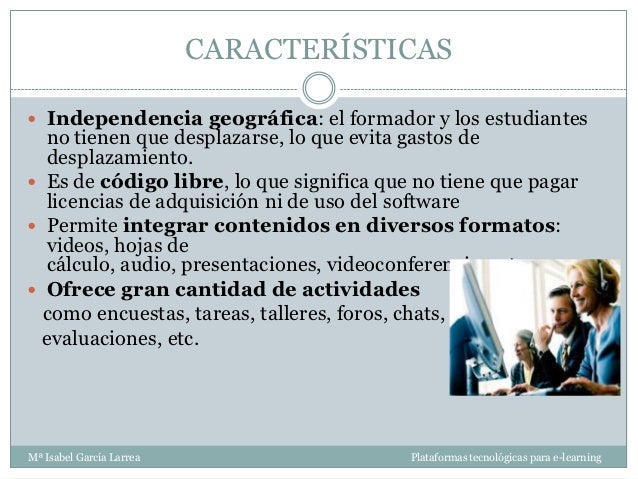 - 15. CARACTERÍSTICAS Independencia geográfica: el formador y los estudiantes no tienen que desplazarse, lo que evita gastos de desplazamiento. Es de código libre, lo que significa que no tiene que pagar licencias de adquisición ni de uso del software Permite integrar contenidos en diversos formatos: videos, hojas de cálculo, audio, presentaciones, videoconferencias, etc Ofrece gran cantidad de actividades como encuestas, tareas, talleres, foros, chats, evaluaciones, etc.Mª Isabel García Larrea Plataformas tecnológicas para e-learning