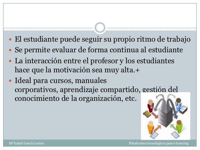 - 16. El estudiante puede seguir su propio ritmo de trabajo Se permite evaluar de forma continua al estudiante La interacción entre el profesor y los estudiantes hace que la motivación sea muy alta.+ Ideal para cursos, manuales corporativos, aprendizaje compartido, gestión del conocimiento de la organización, etc.Mª Isabel García Larrea Plataformas tecnológicas para e-learning