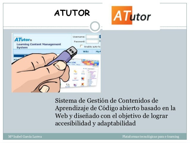 - 18. ATUTOR Sistema de Gestión de Contenidos de Aprendizaje de Código abierto basado en la Web y diseñado con el objetivo de lograr accesibilidad y adaptabilidadMª Isabel García Larrea Plataformas tecnológicas para e-learning