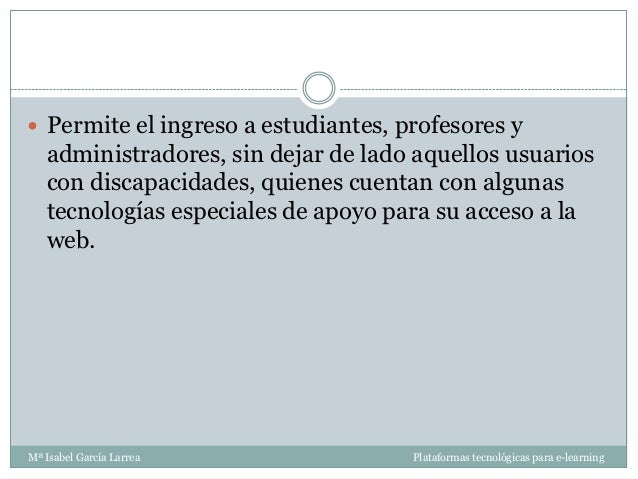 - 19. Permite el ingreso a estudiantes, profesores y administradores, sin dejar de lado aquellos usuarios con discapacidades, quienes cuentan con algunas tecnologías especiales de apoyo para su acceso a la web.Mª Isabel García Larrea Plataformas tecnológicas