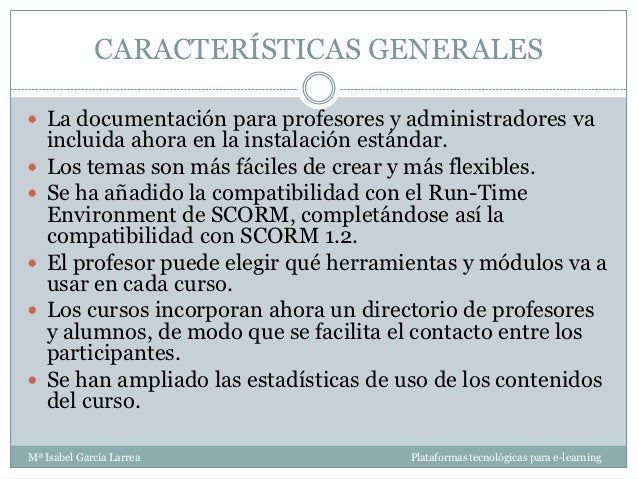 - 21. CARACTERÍSTICAS GENERALES La documentación para profesores y administradores va incluida ahora en la instalación estándar. Los temas son más fáciles de crear y más flexibles. Se ha añadido la compatibilidad con el Run-Time Environment de SCORM, completándose así la compatibilidad con SCORM 1.2. El profesor puede elegir qué herramientas y módulos va a usar en cada curso. Los cursos incorporan ahora un directorio de profesores y alumnos, de modo que se facilita el contacto entre los participantes. Se han ampliado las estadísticas de uso de los contenidos del curso.Mª Isabel García Larrea Plataformas tecnológicas para e-learningEs un Sistemas de Administración de Aprendizaje, ampliamente conocido como Plataforma de Aprendizaje, instalado en un servidor que se emplea para administrar, distribuir y controlar las actividades de formación presencial o E-Learning de una institución u organización.Los sistemas LMS o plataformas de E-Learning generalmente incorporan las siguientes funciones: