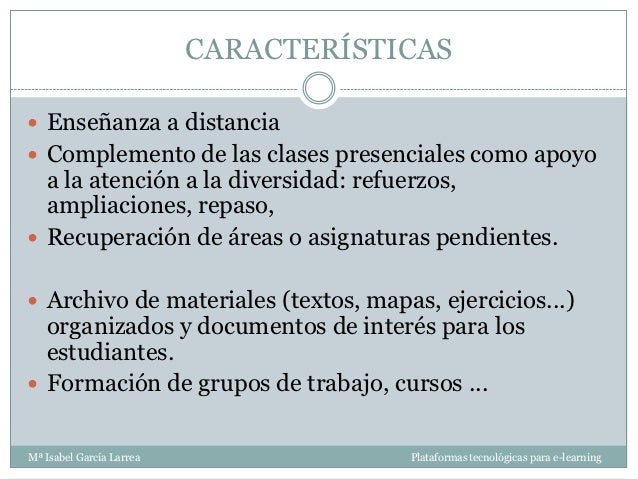 - 4. CARACTERÍSTICAS Enseñanza a distancia Complemento de las clases presenciales como apoyo a la atención a la diversidad: refuerzos, ampliaciones, repaso, Recuperación de áreas o asignaturas pendientes. Archivo de materiales (textos, mapas, ejercicios...) organizados y documentos de interés para los estudiantes. Formación de grupos de trabajo, cursos ...Mª Isabel García Larrea Plataformas tecnológicas para e-learning
