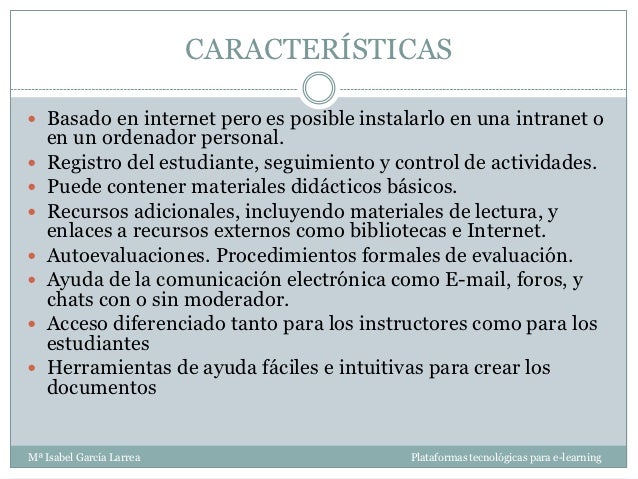 - 5. CARACTERÍSTICAS Basado en internet pero es posible instalarlo en una intranet o en un ordenador personal. Registro del estudiante, seguimiento y control de actividades. Puede contener materiales didácticos básicos. Recursos adicionales, incluyendo materiales de lectura, y enlaces a recursos externos como bibliotecas e Internet. Autoevaluaciones. Procedimientos formales de evaluación. Ayuda de la comunicación electrónica como E-mail, foros, y chats con o sin moderador. Acceso diferenciado tanto para los instructores como para los estudiantes Herramientas de ayuda fáciles e intuitivas para crear los documentosMª Isabel García Larrea Plataformas tecnológicas para e-learning