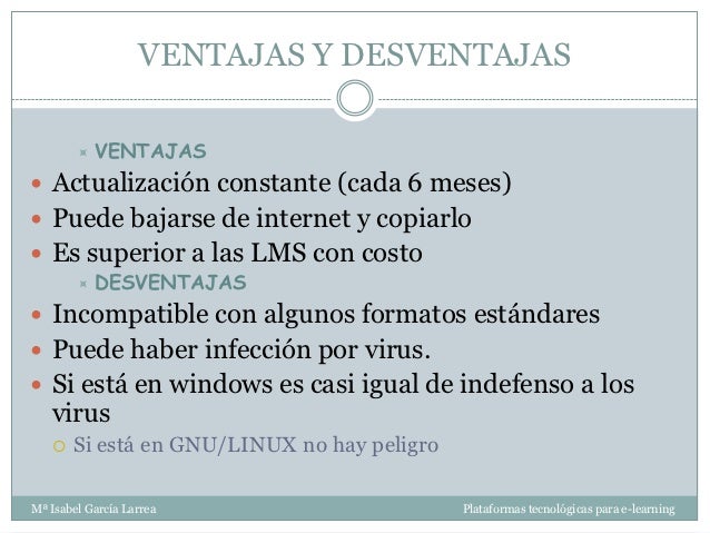 - 8. VENTAJAS Y DESVENTAJAS VENTAJAS Actualización constante (cada 6 meses) Puede bajarse de internet y copiarlo Es superior a las LMS con costo DESVENTAJAS Incompatible con algunos formatos estándares Puede haber infección por virus. Si está en windows es casi igual de indefenso a los virus Si está en GNU/LINUX no hay peligroMª Isabel García Larrea Plataformas tecnológicas para e-learning