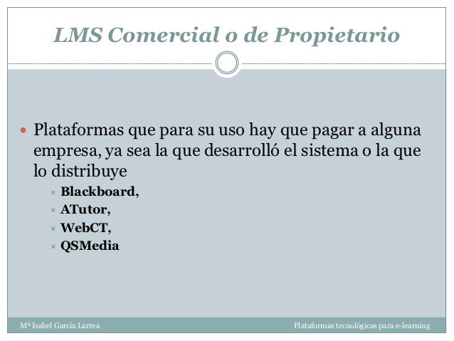 - 9. LMS Comercial o de Propietario Plataformas que para su uso hay que pagar a alguna empresa, ya sea la que desarrolló el sistema o la que lo distribuye Blackboard, ATutor, WebCT, QSMediaMª Isabel García Larrea Plataformas tecnológicas para e-learning